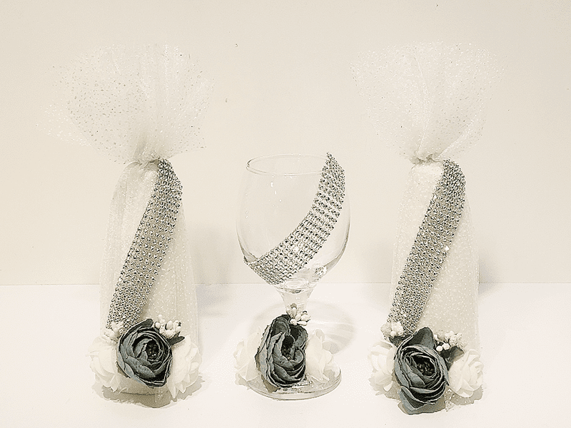 معمولااز جام برای تزیین ظرف عسل استفاده میکنند برای دیزاین گیلاس های عروس و داماد معمولا از گلهای طبیعی یا مصنوعی استفاده میکنند در کنار گلها از روبان تور یا مروارید و سنگهای تزیینی هم استفاده میشود .